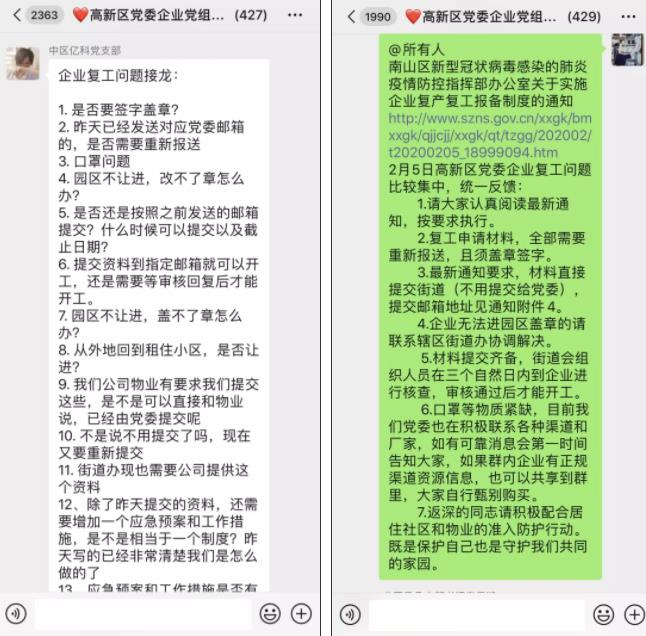 搭建互助共享平台,温情助力。针对企业关注的防护物资紧缺、复工申请等问题,高新区党委通过支部书记工作微信群,及时收集企业困难需求,搭建资源共享平台,畅通信息渠道,实现党企、企企间互通互助。同时,发挥区企服中心优势,对接职能部门、街道等,针对企业在复工材料提交、流程申报、批复等问题,第一时间在线回复、纾困解难,有效缓解了企业员工的焦虑情绪,为园区企业有序复产复工提供了支持,获得企业点赞。