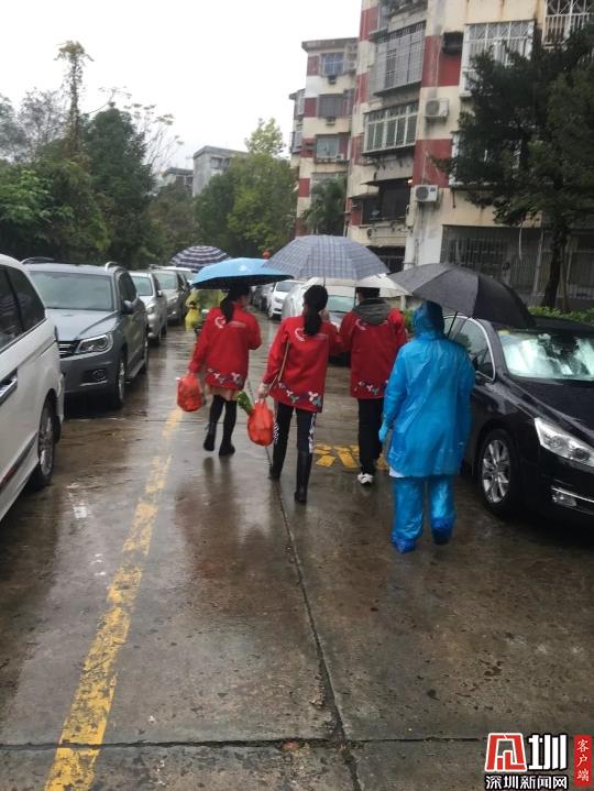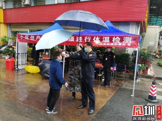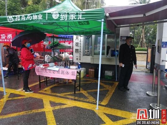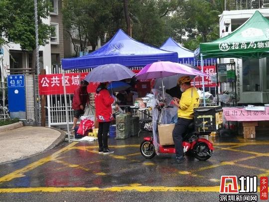 见圳客户端·深圳新闻网讯(记者 董非)2月13日,阴雨连绵。街道空荡荡的,偶有路人行色匆匆,但风雨中的招商街道各小区监测点,奋战在抗疫路上的工作人员依旧坚守岗位,严阵以待,为居民群众生命安全“筑”牢守护网。 榆园小区门口蓝色帐篷“保护”着居民的快递、外卖,站岗人员专注地关注着小区出入人员。 在招商街道桂园社区榆园小区门口,巨大的蓝色帐篷敞开“怀抱”把小区居民的快递、外卖安全地包裹了起来。这个帐篷是街道加强居民小区疫情联防联控“十个一”设置法里的“一顶帐篷”,晴天能遮阳,雨天能挡雨。 今天恰逢连绵雨,居民们感慨帐篷设得及时,有先见之明。帐篷下,党员先锋岗站岗人员丝毫没受到天气的影响,精神高度集中地关注着小区出入人员,一旁的志愿者认真地核对着小区当日发出及回收的居民出入凭证。 花果山小区,社区工作人员及时支起雨伞为正在测量体温的居民遮雨。 在招商街道另一个小区——花果山小区,街道工作人员冒雨来检查小区监测点的防护工作,也现场协助起物业工作人员给出入居民测量体温。为了不让居民淋到雨,另一名社区工作人员及时地支起了伞。 海月社区各卡口支起雨篷,小区监测点的工作人员阵容不减。 下着雨,辖区各个小区监测点的工作人员阵容不仅不减,还多了很多临时来帮忙的社区工作者和志愿者。 有物业工作人员还现场将街道“1234”防控法、“1234”工作法编成了顺口溜:“1234”,全体都有;“1234”,无惧风雨…… 穿着红马甲的社区工作人员给居家隔离的居民送菜送物。 这个雨天,还有穿着红马甲的社区工作人员在各个小区奔波,正上门给居家隔离的居民送菜送物,用心服务居民,风雨无阻。 街道为辖区社区、小区新添置一批防雨御寒和宣传防护物资。 雨衣3000件、口罩4800个、海报展板500份,还有护目镜、橡胶手套、额温枪……这个雨天,街道还为辖区社区、小区新添置一批防雨御寒和宣传防护物资。街道微信工作群里“写”满了对前线工作者防雨御寒的叮咛。