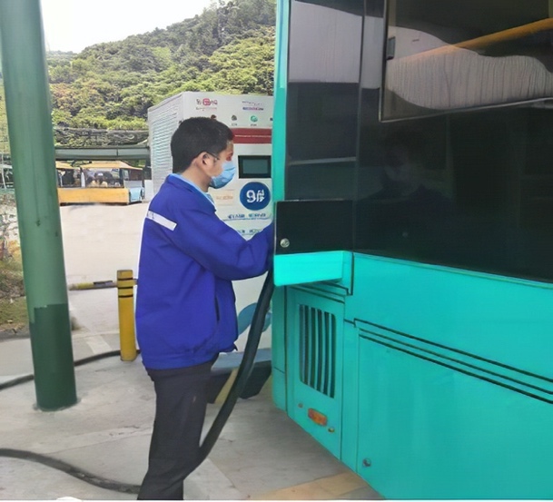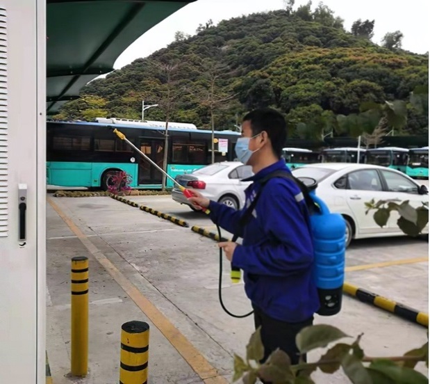 (左:工作人员正在为大巴充电,右:工作人员正在为充电场站进行消杀)