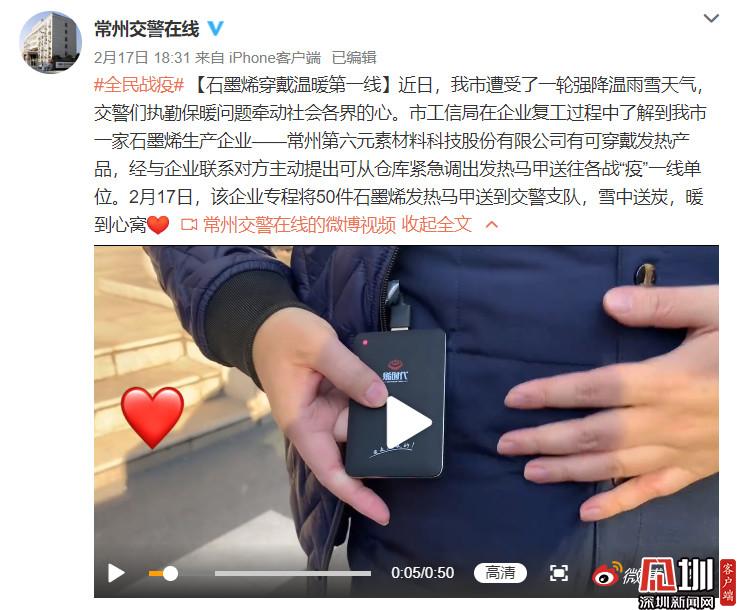 2月18日,一场大雪降临常州,风大雪大温度低,常州各单位一线工作者坚守岗位,一如既往地扎实做好疫情防控工作。烯旺科技联合兄弟企业常州第六元素向奋斗中在抗疫中执勤一线的常州交警支队,惠山区公安局、惠山经济开发区执勤人员捐赠共计160件纯石墨烯发热马甲,价值23.7万元,以此向一线工作者送去温暖,并致以崇高的敬意。