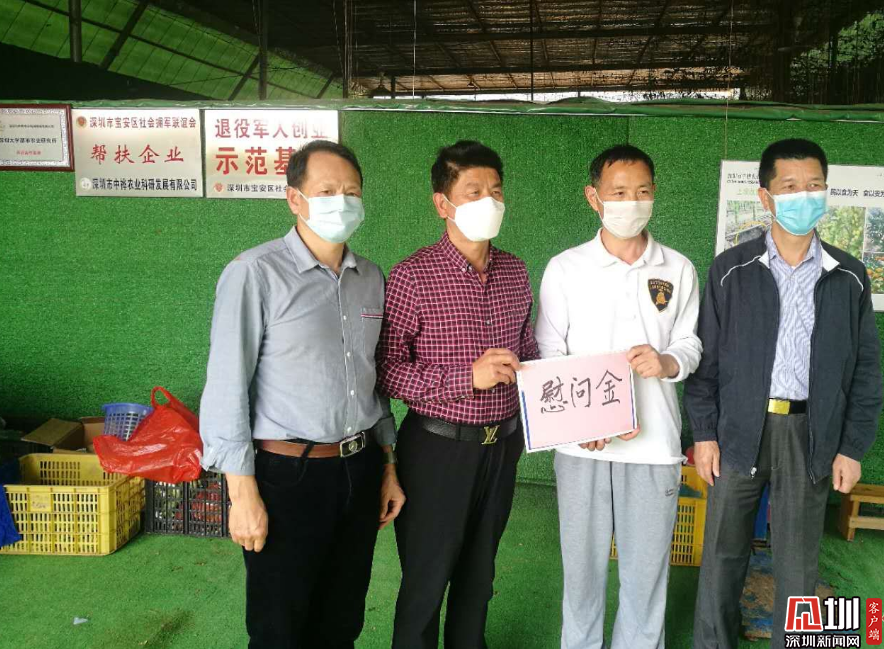 2月22日下午,宝安区退役军人事务局局长刘伟、 宝安 区社会拥军联谊会会长李新华, 以及汇骏丰资产管理有限公司党支部代表等人 , 专门驱车前往深圳市中桦农业科研发展有限公司位于宝安区燕罗街道的蔬菜基地,慰问该公司员工并送上慰问金。