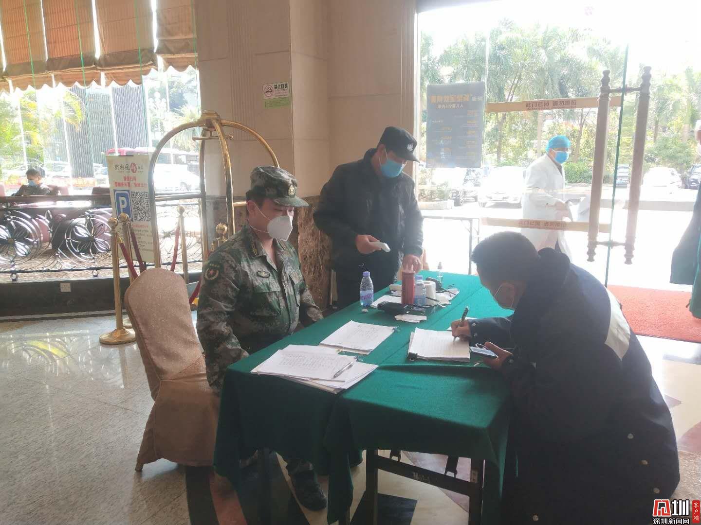 执勤民兵在新桃园酒店医学观察点参与“疫区”返深人员隔离守点登记。