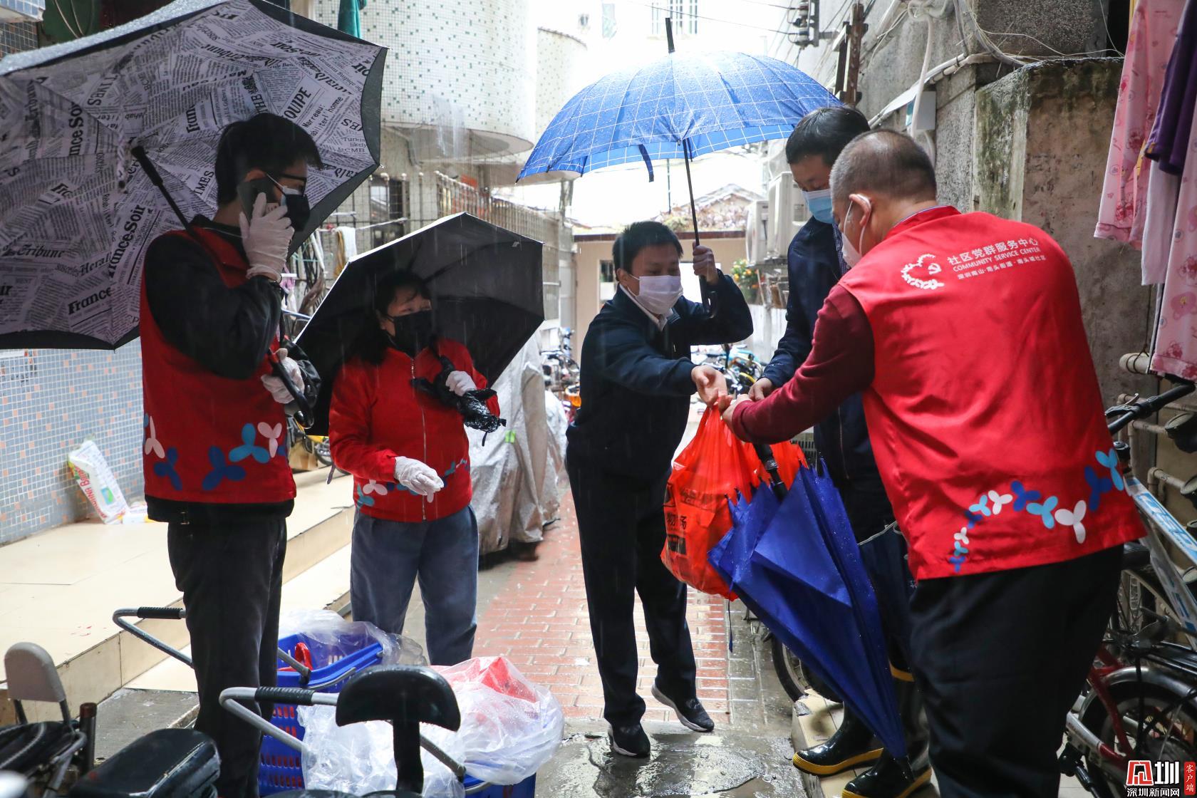 熊光球冒雨给居家隔离观察人员家长送菜等生活物资。