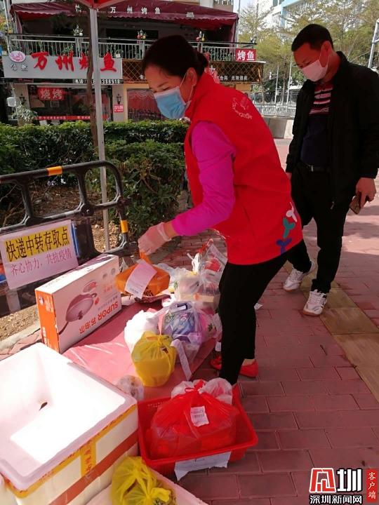 朱丽凤在快递点帮隔离居民送物资(左一)