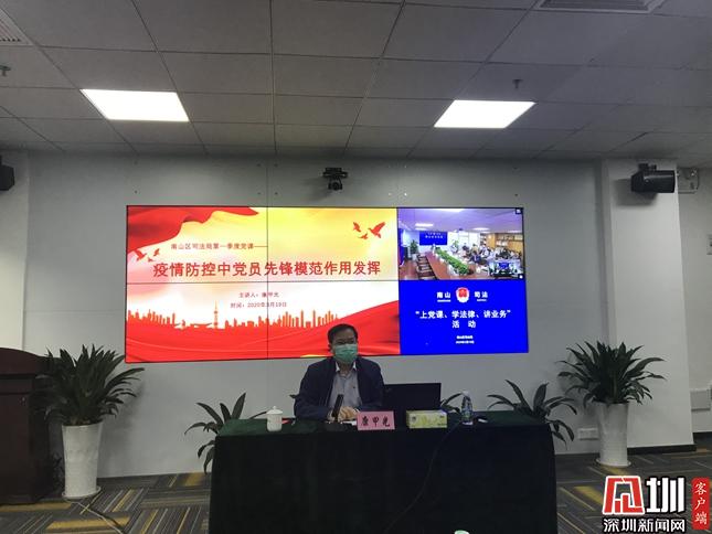 见圳客户端·深圳新闻网讯(记者 王志明 通讯员 陈海涛 摄影 叶剑锋)15名党员干部下社区,机关党员干部积极争当防疫工作志愿者、法律顾问、调解员和法律法规宣传员……新冠疫情发生以来,深圳市南山区司法局党组带领党员干部积极投身于疫情防控工作中,在各个不同的工作岗位,用实际行动讲述南山司法行政人抗疫故事,书写爱党爱国情怀。为了鼓励全体党员干部再接再厉继续战斗,进一步提升抗疫工作热情和干劲,3月19日,该局党组书记、局长康甲光给全体党员干部上了一堂生动的抗疫专题党课。