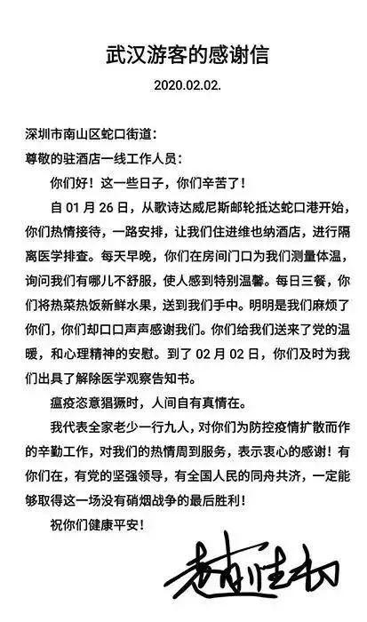 ●旅客赵性初在解除隔离时,将一封感谢信交到工作人员手中,在信中,他写道:“每天早晚,你们在房间门口为我们测量体温,询问我们有哪儿不舒服,使人感到特别温馨。每日三餐,你们将热菜热饭新鲜水果送到我们手中。明明是我们麻烦你们,你们却口口声声感谢我们……瘟疫恣意猖獗时,人间自有真情在!”