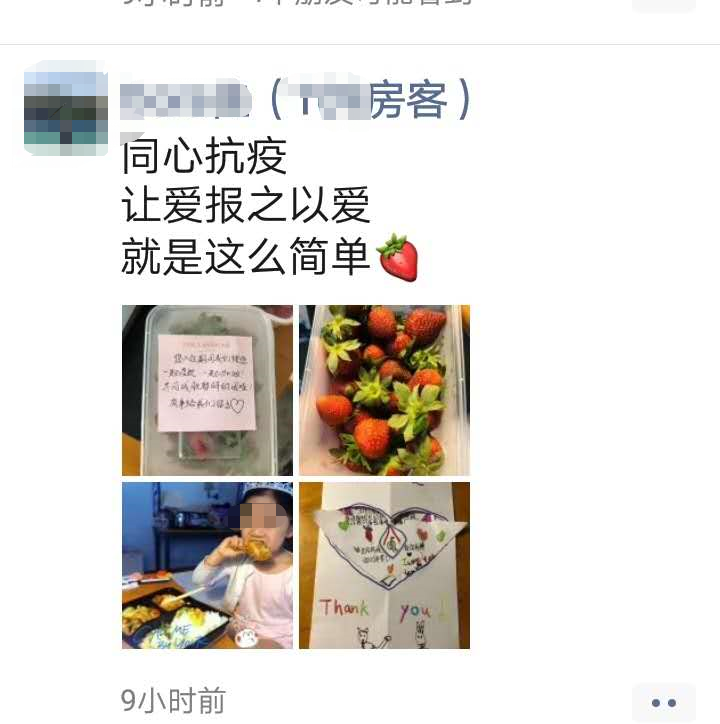 “特别温暖,因为有你们,昨天的草莓小孩特别喜欢吃,新鲜的很,你们费心了!再紧急都没有疫情紧急,我们一定配合好工作,不给防控大局添乱”