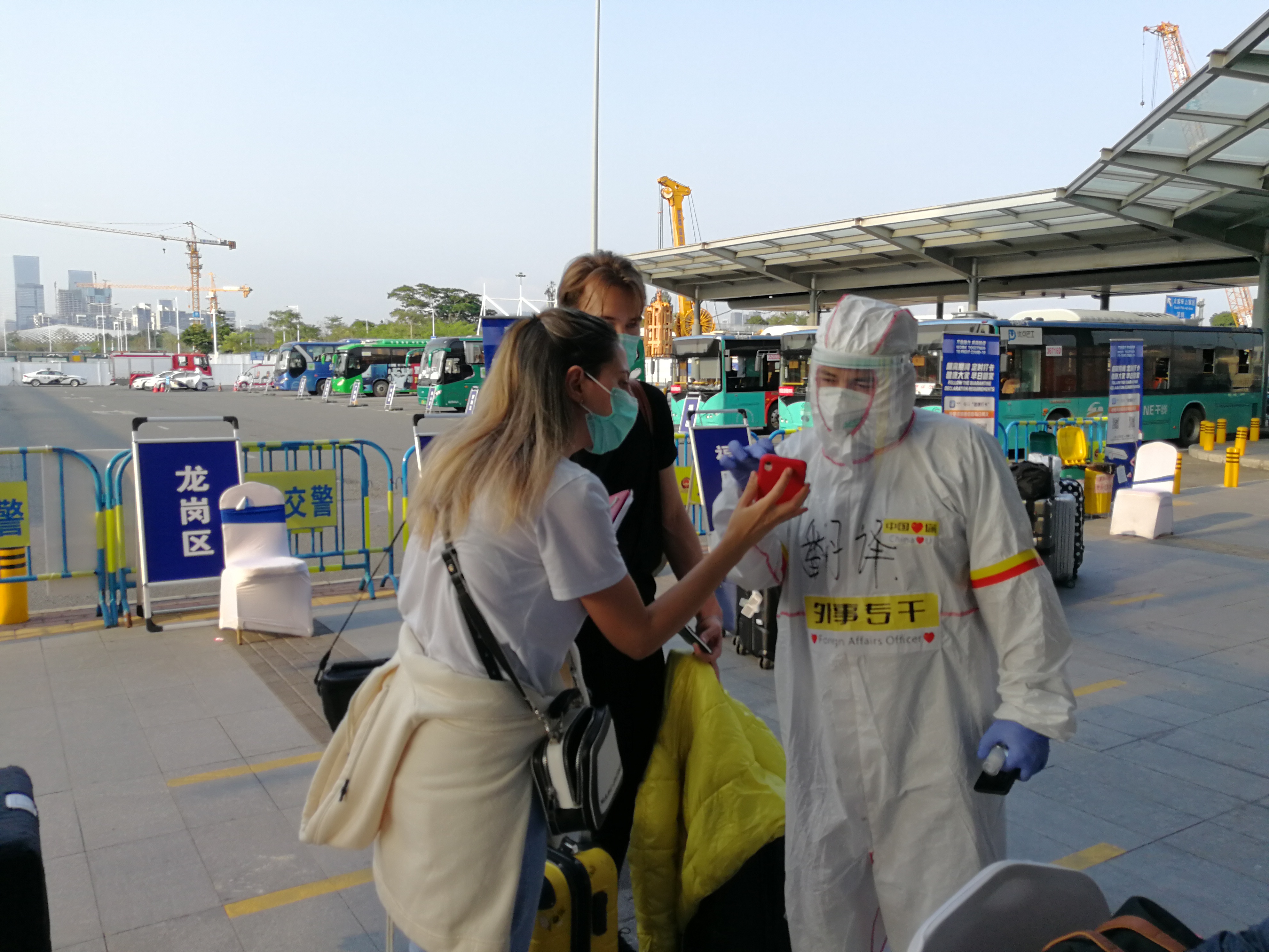 海外疫情暴发后,区委外办协助相关部门在码头、机场等重点地区开展入境外籍人员转运工作。每当有防控对象抵达,外事专干和国际志愿者总会在第一时间与相关负责部门一同赶赴宝安机场或广州机场等地,在等到入境人员的各种检测结束后,对入境人员进行分组和疏导,并将有关人员及时转运。外事专干和国际志愿者在现场还进行解释说明和沟通工作,在安抚入境人员情绪的同时,也让这些人员认识到疫情形势的严峻性和防控工作的重要性,从而稳定现场的秩序。