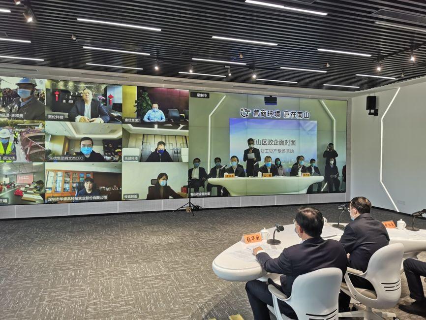 21日的南山区政企面对面活动现场,政府部门与200多家企业负责人线上“面对面”沟通,商讨解决问题。
