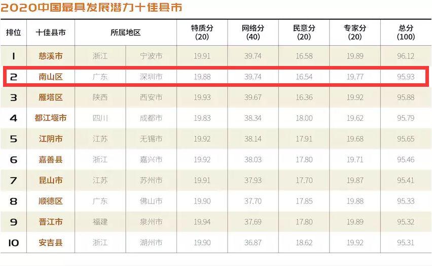 南山位居“2020中国最具发展潜力百佳县市”第二