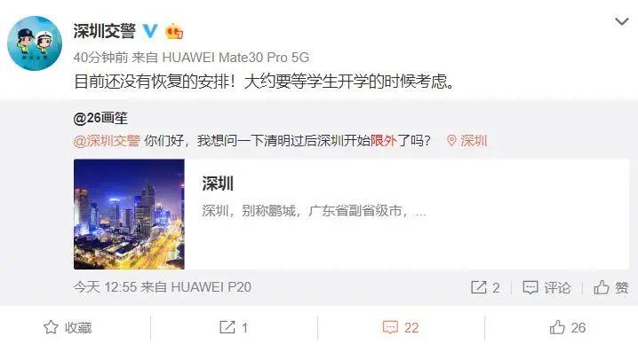 对于此前车主们一直关心的限外问题,深圳交警都表示防疫期间暂停限外,今天@深圳交警 给出了最新回复,“目前还没有恢复的安排!大约要等学生开学的时候考虑。”这意味限外将根据学生开学后车流情况进行安排。