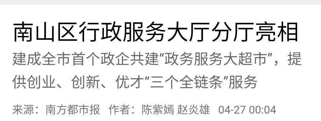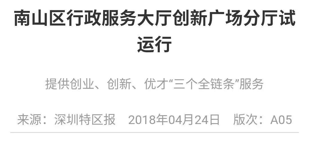 南山区行政服务大厅创新广场服务厅进一步推动了深圳新型智慧城市的建设,实现智慧化公共服务基本覆盖园区,“企业办事不出区,个人办事不出街”的政务服务模式已加快实现,提升了城市生活的便捷化、高效化。