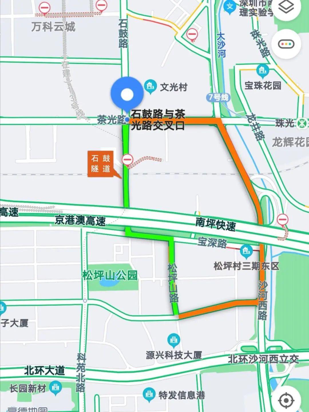 ▲西丽往科技园北区此前需绕行沙河西路(黄色途径),现经石鼓隧道可快速到达(绿色途径)。