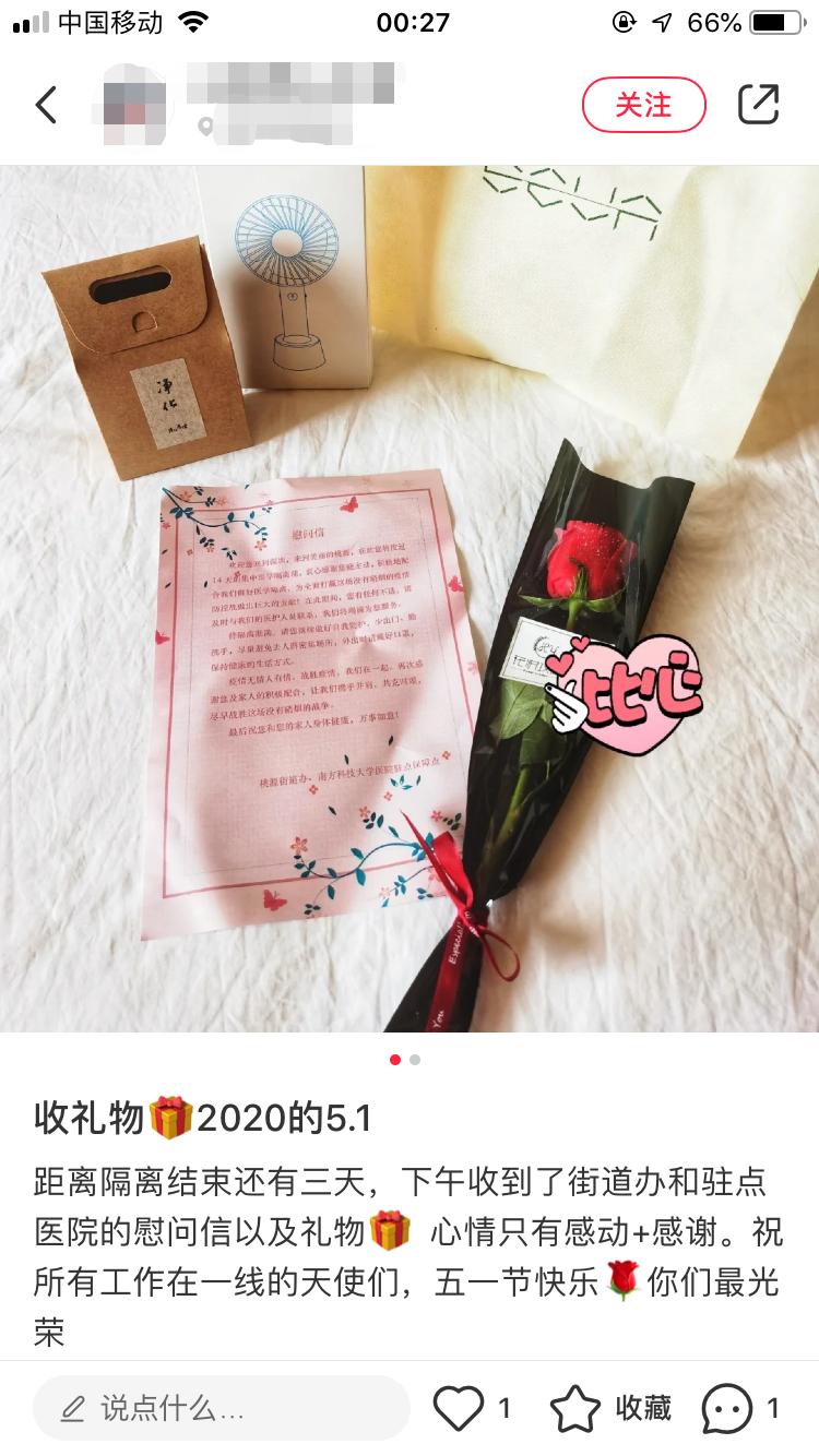 ▲5月1日,收到街道节日礼物的隔离人员,在社交平台发言感谢。
