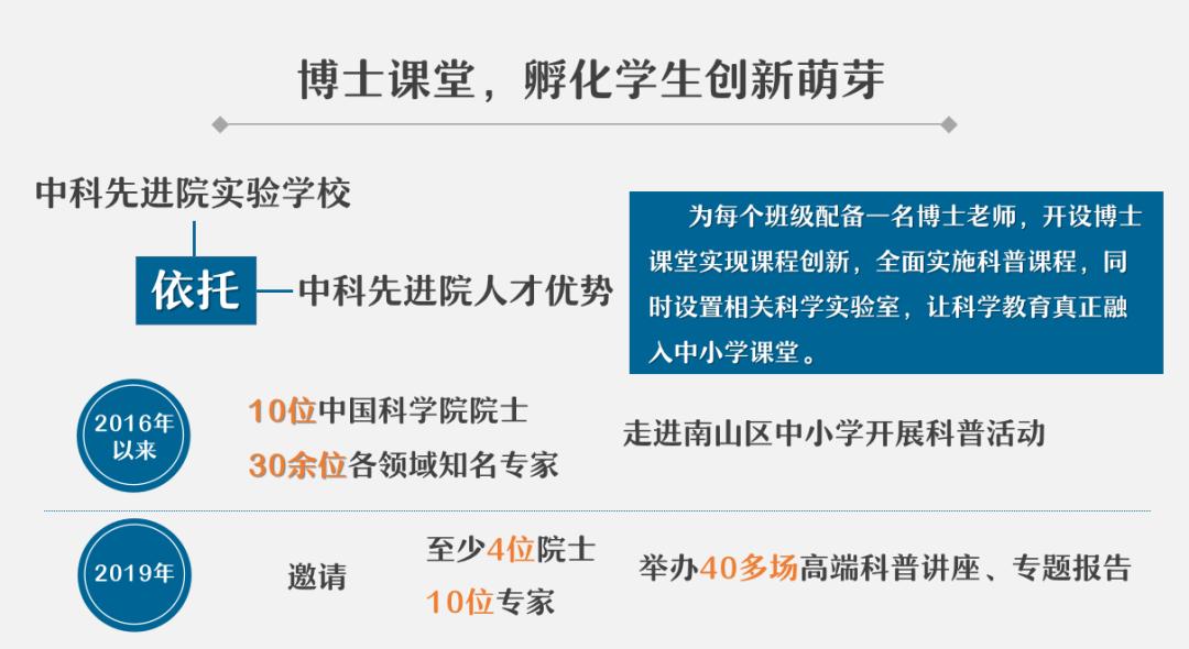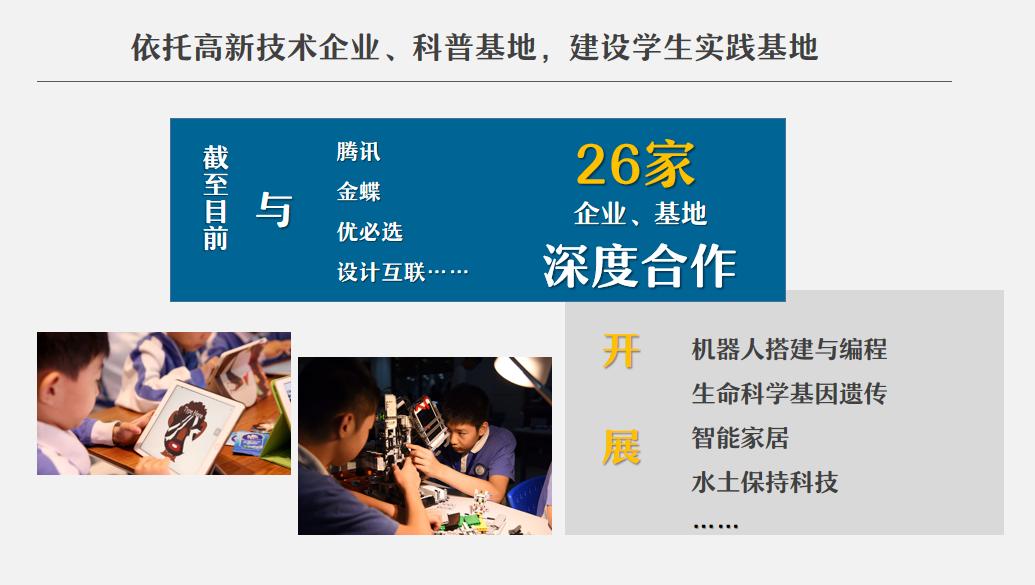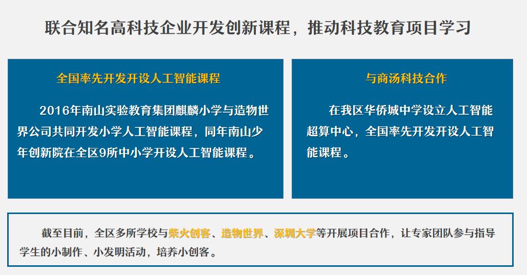 智库专家进课堂,孵化学生创新萌芽;与高新技术企业、科普基地深度合作,建设学生实践基地;与知名高科技企业开发创新课程,推动科技教育项目学习...南山教育整合科技创新资源,为学生打造了丰富的创新教育渠道。