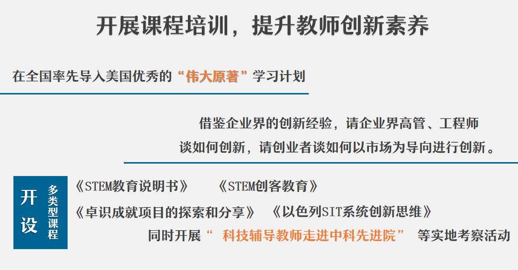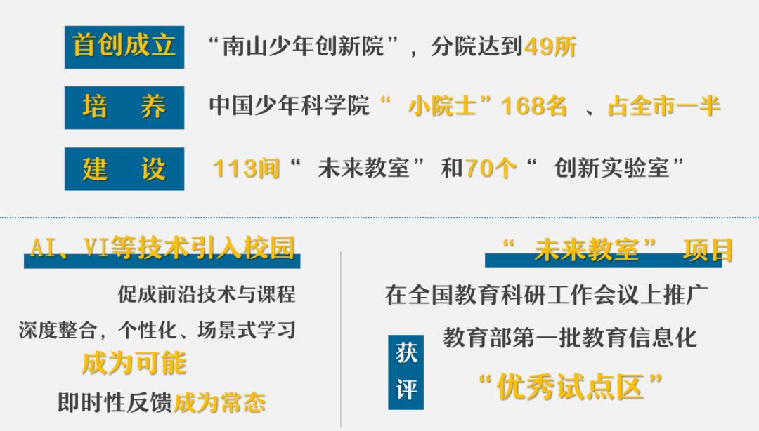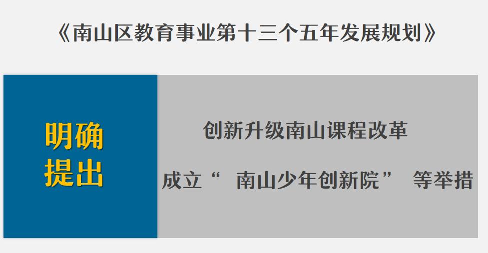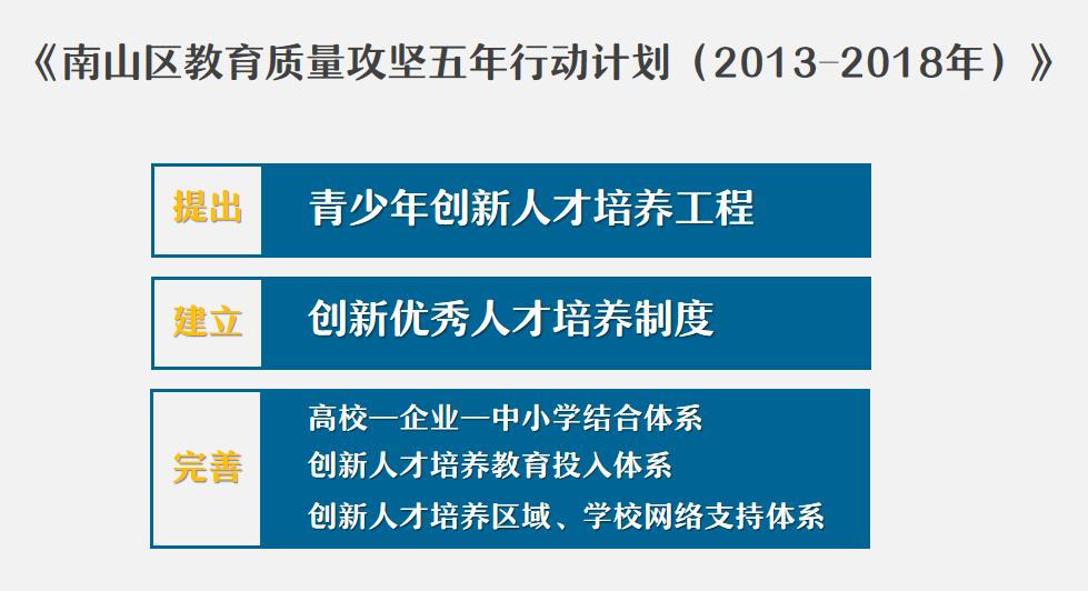 南山科学谋划创新教育,提前进行顶层设计。在《南山区教育质量攻坚五年行动计划(2013-2018年)》《南山区教育事业第十三个五年发展规划》《南山区科技创新教育特色发展实施方案》等文件中,就创新教育的实施办法等作了具体部署,确保创新教育落地实施。