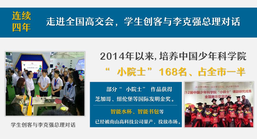 南山少年创新院已开展了5届“小院士”评选活动。通过网络评选、现场评选、专家评选相结合的方式,搭建一个创新成果展示与交流的平台,既扩大了创新院的社会知名度和关注度,也同时丰富了对学生进行多元评价的探索与实践。