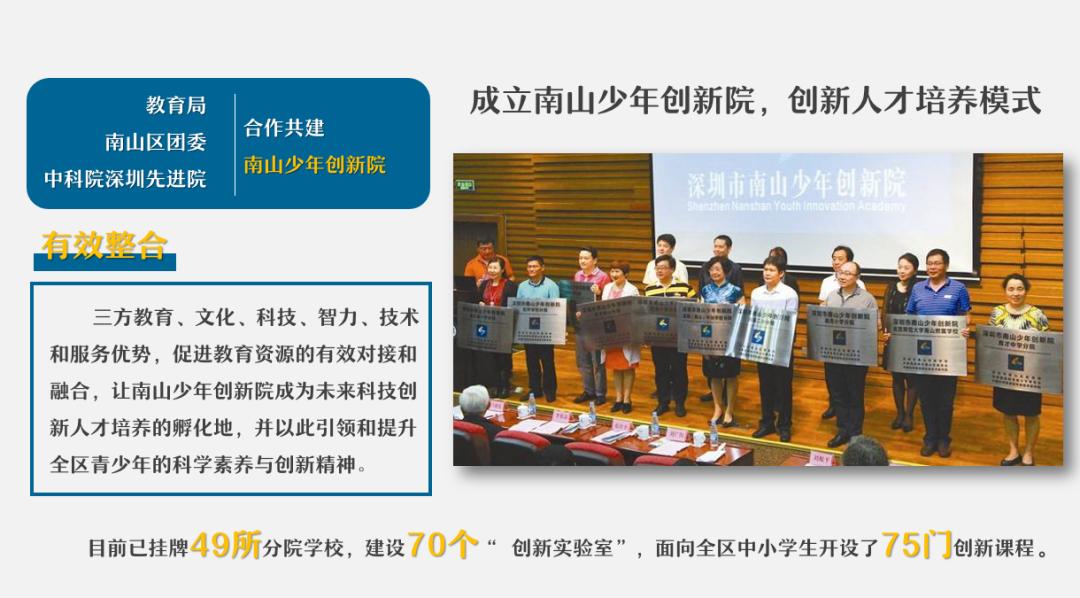 南山少年创新院是深圳市首个公益性青少年校外创客服务平台,以服务7-15周岁少年自主创新实践为核心理念,培养具有独立思考能力且具有创新精神品质和实践能力的人才。目前,南山少年创新院分院学校达到49所。