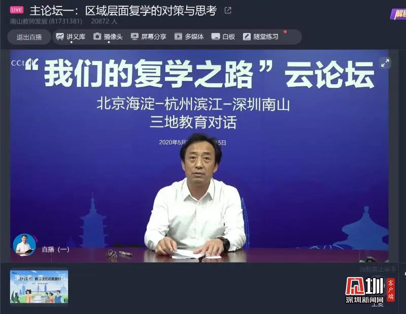 见圳客户端、深圳新闻网讯(记者 徐哲康)因为此次疫情,学生的学习习惯和学习方式,都发生了极大的变化。返校复课后,教育是重启还是重构呢?5月30日下午,南山区政协副主席、区教育局局长刘根平针对这一问题,在“‘我们的复学之路’云论坛:北京海淀-杭州滨江-深圳南山三地教育对话”活动中,与三地家长、教师以及专家学者进行交流分享。