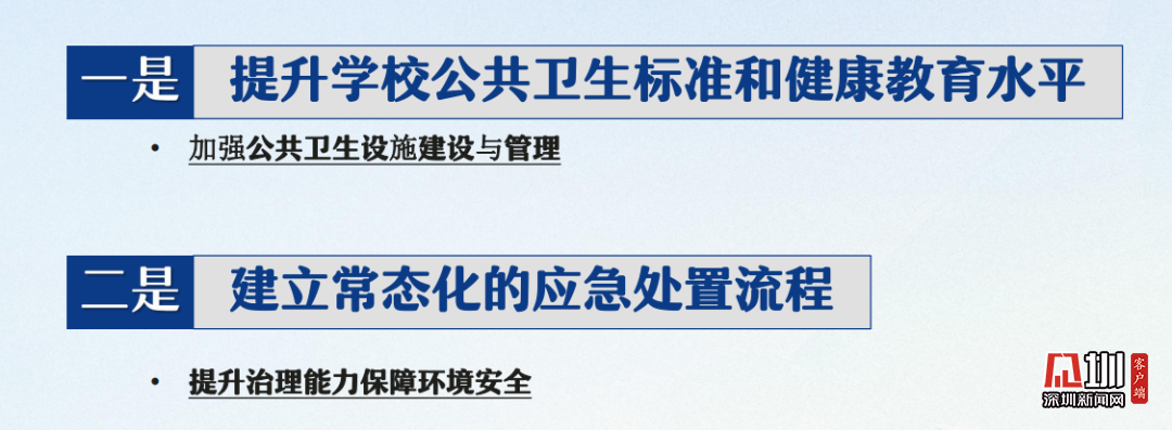 六是重新制定学校公共卫生标准。“我们必须在学校建设与管理中,将公共卫生设施建设与管理摆在重要位置。重视学生身心素养的培养,着力提升学校公共卫生标准和健康教育水平。建立常态化的应急处置流程,提升治理能力保障环境安全。”
