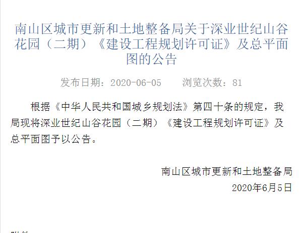 近日,南山区城市更新和土地整备局发布公示深业世纪山谷花园(二期)的《建设工程规划许可证》及总平面图,称此项目已获批建设。