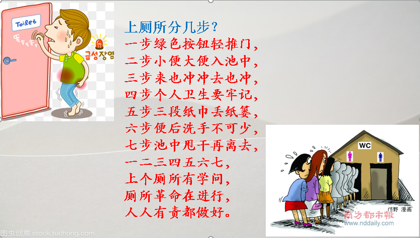 怎样教会孩子上厕所?这是一项技能更是一个好习惯。工作室创作的童谣中这样写到:“《上厕所分几步?》一步绿色按钮轻推门,二步小便大便入池中,三步来也冲冲去也冲,四步个人卫生要牢记,五步三段纸巾丢纸篓,六步便后正确洗手不可少,七步池中甩干再离去,一二三四五六七,上个厕所有学问,厕所革命在进行,人人有责都做好。”通过童谣孩子们不仅学会了上厕所的步骤,知道节约纸张,更了解到全国上下正在进行一场轰轰烈烈的厕所革命,文明如厕,把爱国教育落了地。