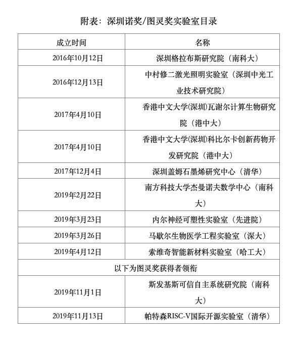格拉布斯研究院、中村修二激光照明实验室、瓦谢尔计算生物研究院、科比尔卡创新药物开发研究院、盖姆石墨烯研究中心,深圳在2017年底前已建成5家诺奖实验室。