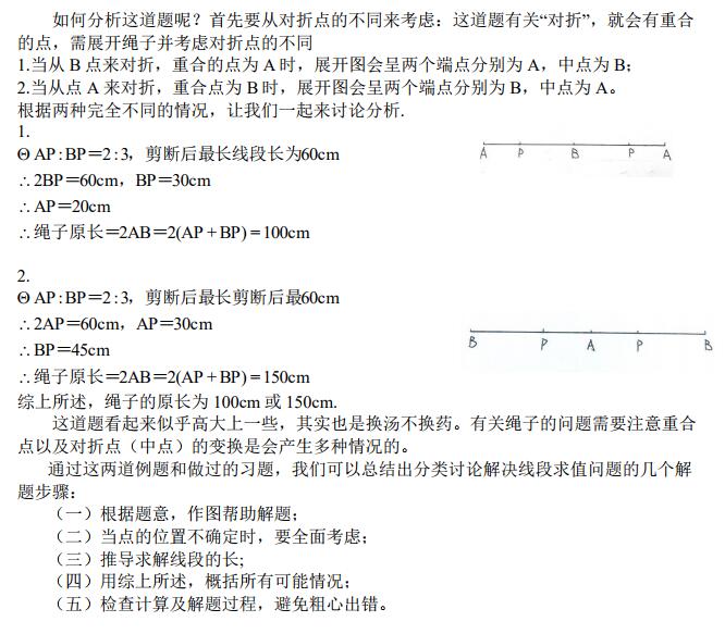 通过对线段求值问题的学习,我们明白考虑问题要“多方面全角度”。从线段各端点的不同位置,到对折绳子,再展开到其它线段问题的解答,万变不离其宗。
