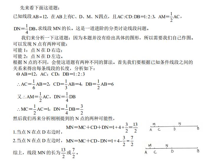 我们可以发现,分类讨论线段长度的问题一点也不难,首先根据已知条件画出线段,然后根据题意确定点的位置,要细致全面考虑点的所有可能位置。一览全局,才能大获全胜。也温馨提示一下:没有第二种可能情况的,千万不要画蛇添足,要确认理解题意后再进行推断。