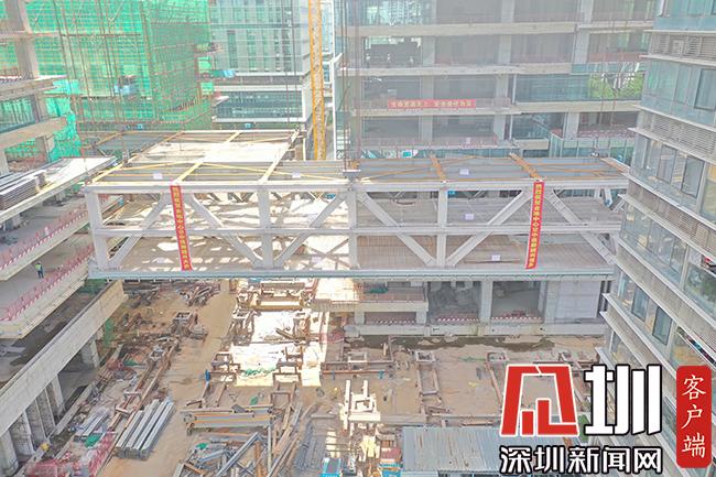 深圳金地中心空中连廊吊装工程,是将一个重达1670吨、面积约2400平方米的Z字形钢结构,沿着A、B、C三座塔楼之间,吊至B座近楼顶处,并与A座相连。