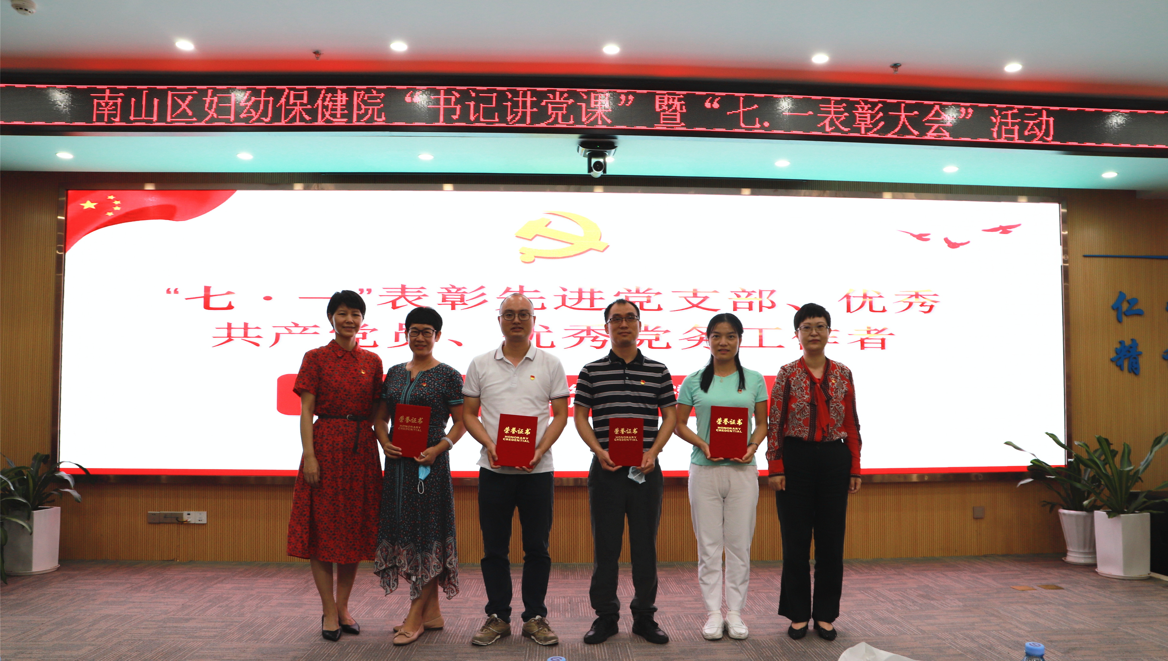 为深入贯彻习近平新时代中国特色社会主义思想和党的十九大精神,庆祝中国共产党成立99周年,激励全院13个党支部和广大党员“不忘初心,牢记使命”,在新冠肺炎疫情常态化防控和打造妇幼健康高地等工作中发挥党组织战斗堡垒和党员先锋模范作用,南山区妇幼保健院召开表彰大会,表彰了获南山区委卫生工委“优秀党务工作者”荣誉称号的邓特、“优秀共产党员”荣誉称号的陈雷平、张丹、一线抗疫代表黎小梅和院级的2个“优秀党支部”、2名“优秀党务工作者”及13名“优秀共产党员”。表彰会上,南山区卫健局副局长朱薇要求全院各基层党组织和全体党员干部要以先进为榜样,突出党建引领,奋力抢前争先,不断锐意进取,充分发挥党组织的战斗堡垒作用和党员的先锋模范作用,为统筹推进疫情防控和医院医疗卫生事业发展做出新的更大的贡献。