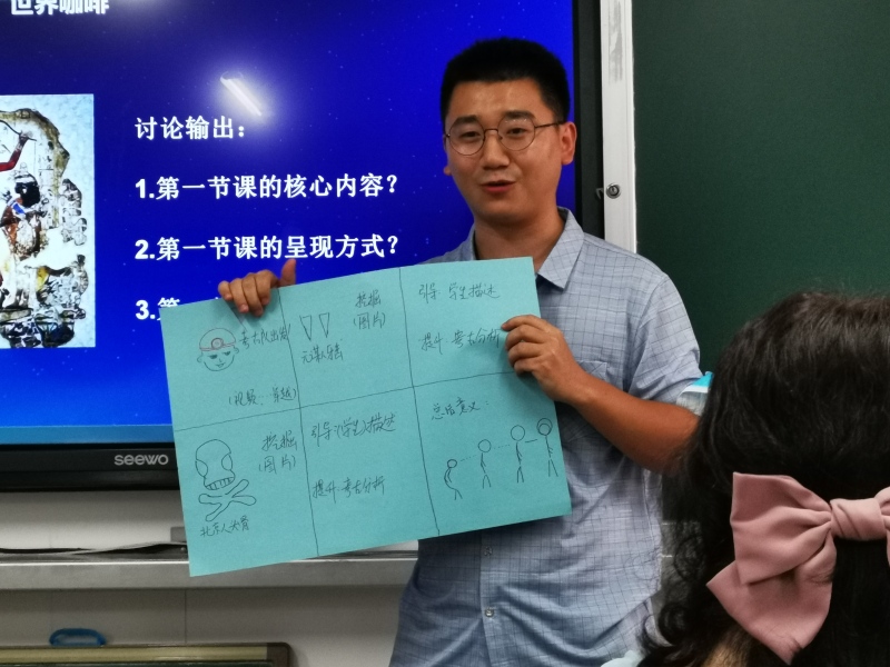 第一个环节,教学设计。新岗教师分为四个小组探究“如何设计第一节课”,经过讨论,认为应从“历史是什么”、“为什么要学历史”、“中学历史学什么”、“如何学好历史”等几个方面设计新学期导言课。