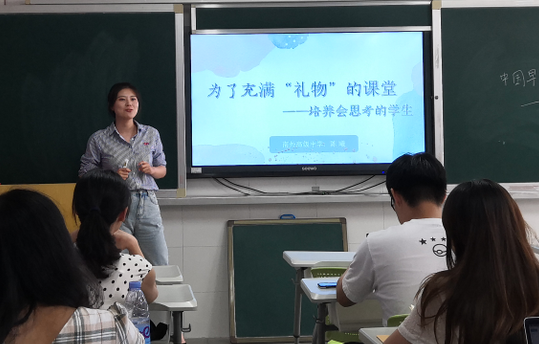 第二个环节,汇报展示。深圳大学附属教育集团外国语中学的宫伊泽老师、南海中学的杨若梅老师、麒麟中学何思浩老师、海德学校杨红霞老师进行模拟授课。园丁学校的唐瑾老师在点评中提出,教学情景设置中的人物设定最好能有史料作支撑,要根据实际情况来选择使用描述性材料还是结论性材料。