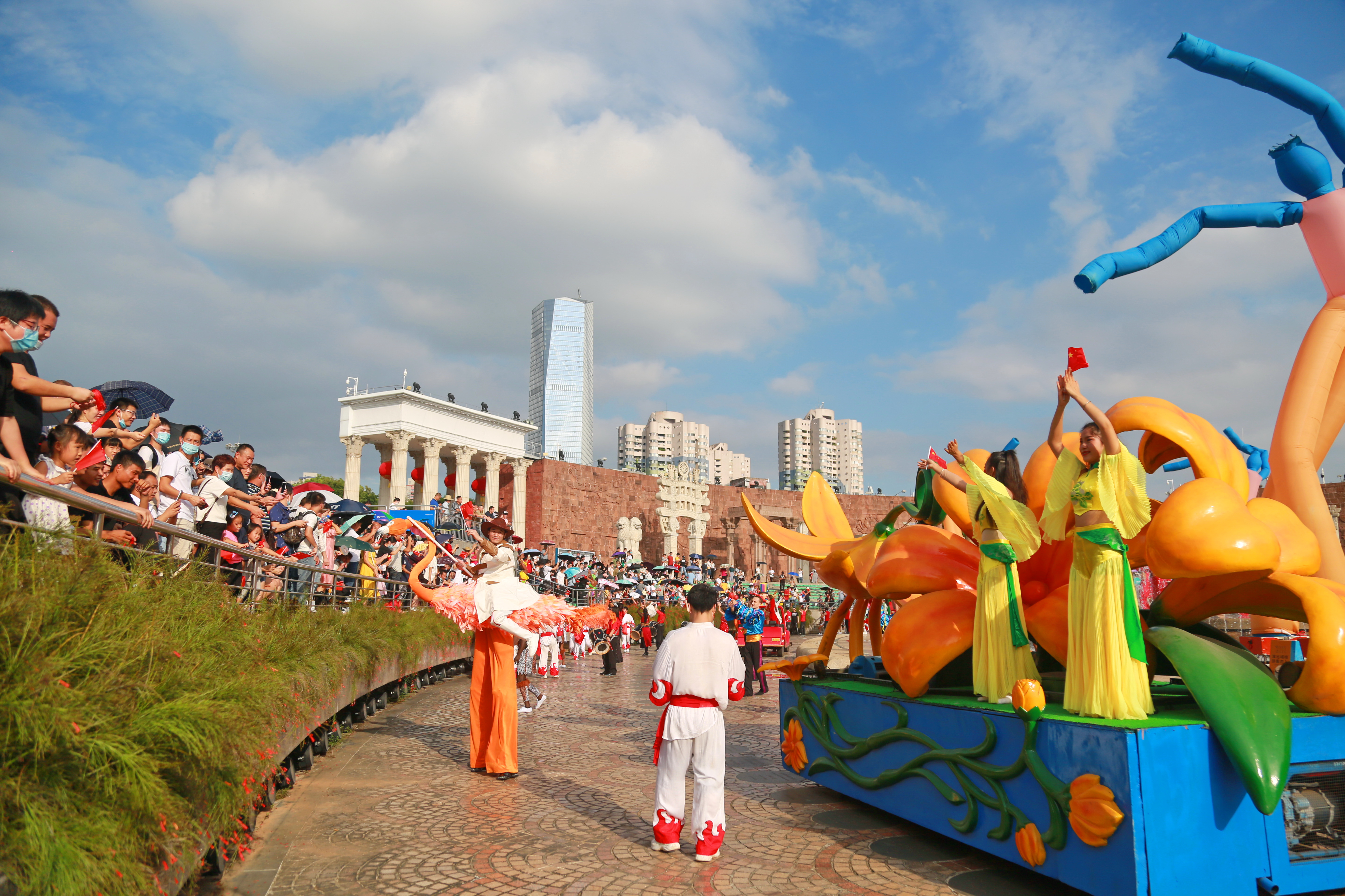 16:00,狂欢大巡游在世界广场盛大开演,舞台下人头攒动,座无虚席。绚丽的花车、彩车游行伴随着舞蹈演艺向全场观众传达着世界风采与激情。代表着世界五大洲的巡游彩车在环道上驶过,观众席中不时爆发出热烈的欢呼声。玻璃舞台上,街舞、武术、异国风情舞蹈表演轮番上演,游客也随着演员们欢快起舞。