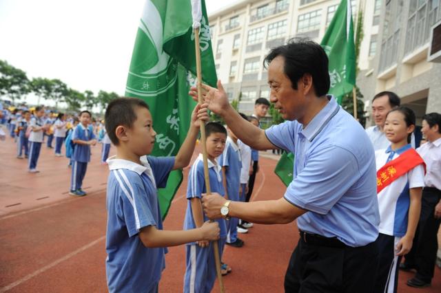 2015年,在南山区政协副主席、教育局局长刘根平的倡导下,赤湾学校举行了首届"绿色之行,文化之旅"主题德育活动(2018年被教育部评为全国德育典型案例)。图为2015年刘根平为首届活动授旗。(吕雪良摄)
