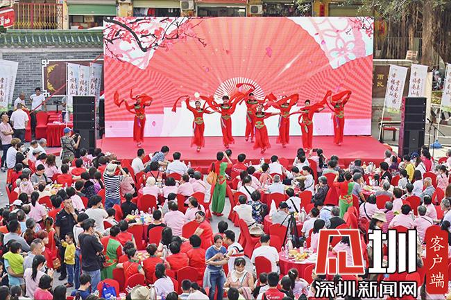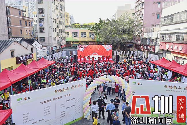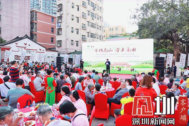 “幸福南山、孝亲南园”。主会场的活动安排在吴氏宗祠前广场,邀请逾200余位南园社区长者到现场,为他们打造一场精彩的文化义演活动:粤剧、红歌、书法、醒狮舞、古琴、广场舞等互动表演精彩纷呈,让长者们尽情享受一个惬意的周末下午时光。活动还结合了南园美食节活动和专为老人免费提供的肿瘤筛查、白内障义诊活动,深度贴合辖区老人的需求,现场洋溢着浓浓的敬老爱老氛围。
