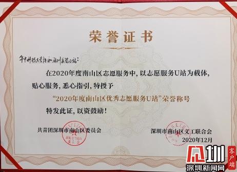 见圳客户端、深圳新闻网讯(记者 曹文丽 通讯员 黄坷 冯力)为致敬深圳经济特区建立40年,感激南山区志愿服务同仁在2020年对南山区志愿服务发展的无私奉献,12月3日,南山团区委在南山区青少年活动中心(滨海部)举行了“靓丽志愿红,南山正青春”2020年国际志愿者日主题活动。团市委副书记张冬冬,区委常委、宣传部部长廖子彬,区委宣传部副部长、区文明办主任宁少贤,团区委书记金翠参加活动并为获奖代表颁奖。华中科技大学协和深圳医院U站荣获南山区“优秀志愿服务U站”。