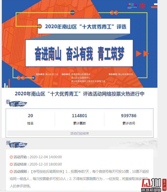 终评会结束后,将产生2020年度南山“十大优秀青工”,在南山区第十五届青工文件节上进行隆重表彰,并授予南山“十大优秀青工”荣誉称号,排名第11-20名南山“十大优秀青工”候选人颁发2020年南山“十大优秀青工”提名奖证书;对评选过程中工作表现突出的3家优秀基层工会组织,给予优秀组织奖。本届活动还得到了共青团南山区委员会、南山区企业服务中心、南山区各街道总工会及区总直管工会的大力支持。