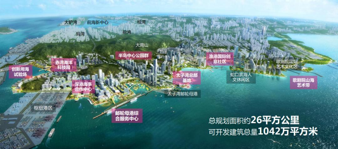 蛇口国际海洋城 总规划面积约26平方公里(其中陆域、海域各13平方公里),可开发建筑总量(含城市更新)1042万平方米。