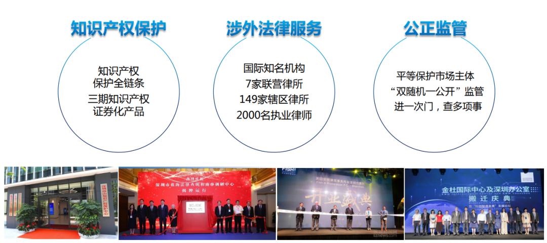 涉外法律服务 为适应境内外商事调解需求越来越多的趋势,推动全国首个域外法律查明平台——蓝海法律查明和国际商事调解中心运营。引进美国斐锐和英国罗思等多家国际知名机构,辖区律所增至149家,律师人数近2000名。全市7家联营律师事务所均在南山,超过全省60%。