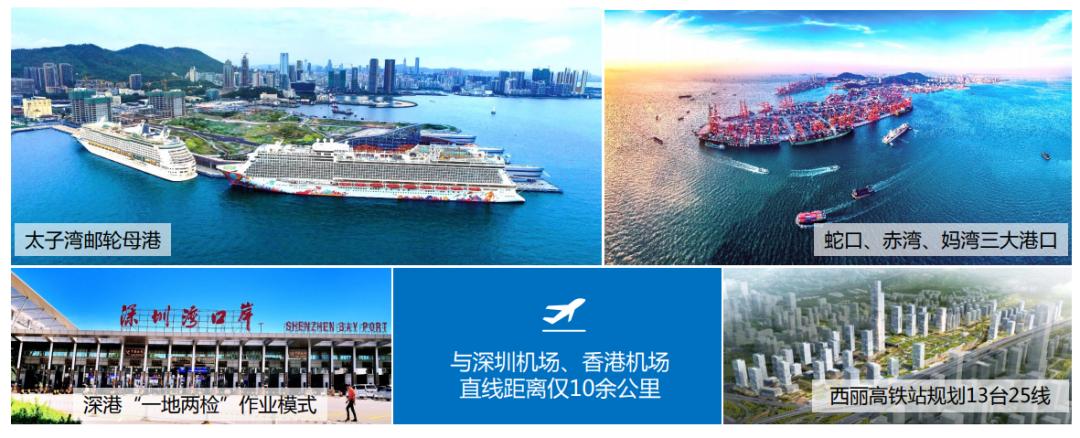 交通优势 海陆空铁交通基础设施发达,对外辐射能力强劲。太子湾邮轮母港是华南地区最大的邮轮母港,蛇口、赤湾、妈湾三大港口联通世界;深圳湾口岸是内地首次采用深港“一地两检”作业模式的口岸;与深圳机场、香港机场直线距离仅10余公里;西丽高铁站纳入全市客运主枢纽,规划13台25线,实现国铁、城际与城市轨道交通便捷换乘。