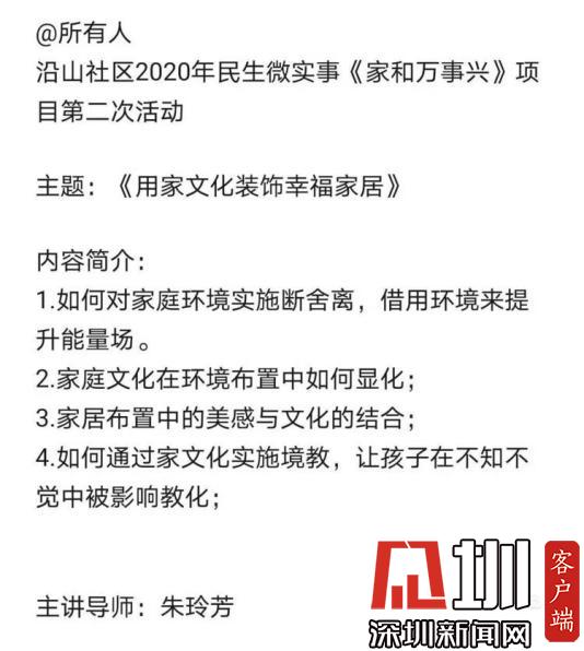 见圳客户端、深圳新闻网讯(记者 王志明)“广大家庭都要弘扬优良家风,以千千万万家庭的好家风支撑起全社会的好风气。”南山区招商街道沿山社区党委引入2020年南山区民生微实事前100强项目“家和万事兴”,为构建和谐社区、打造“沿山家风”名片奠定人文基础。