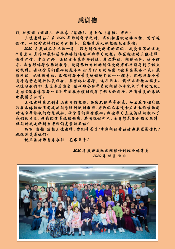 正如素芳、冬菇等社区居民在感谢信中所写:“2020年是极不平凡的一年,作为朗诵爱好者的我们,感受最深的还是11月到12月份田厦社区举办的朗诵培训班学习过程……为枯燥的生活增添了色彩。”