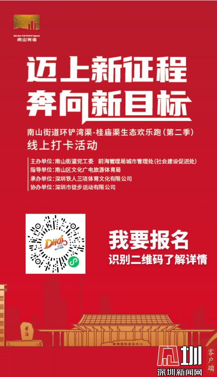 见圳客户端、深圳新闻网讯(记者 王志明)为满足辖区居民的健身需求,鼓励更多来深建设者春节留深,深圳市南山区南山街道党工委和前海管理局城市管理处在做好疫情防控工作的同时,积极响应国家号召,于近日联合启动了以“迈上新征程奔向新目标”为主题的南山街道环铲湾渠-桂庙渠生态欢乐跑(第二季)线上打卡活动:从即日起至春节期间,居民均可通过手机扫码直接参与。