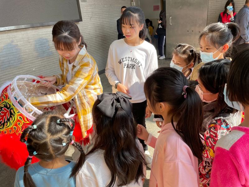 在正式学习舞狮之前,向南社区醒狮队队部师兄师姐先为孩子们表演了醒狮拜年,看着师兄师姐娴熟的动作,看着造型独特的狮头,孩子们都惊叹不已,激发起他们学习舞狮的热情。随后孩子在师兄师姐的指导下开始了认真的学习。先从最简单的张嘴、摇尾学起,然后是步伐和舞腾,不一会孩子们就学的有模有样了。在旁边维持秩序的义工随着气氛高涨也忍不住跟着鼓声动了起来。“原来留在深圳过年,也可以很好玩,真是一个难忘的留深假期。”拿着狮头的林少芬同学说。