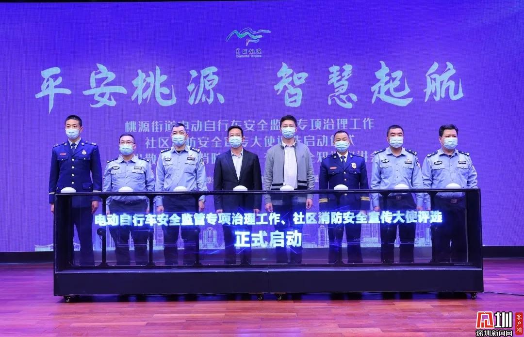 桃源街道党工委书记黄健,桃源街道二级调研员龙正国,南山消防救援大队长邓天峰,南山交警大队副大队长陈志文,桃源派出所副所长林伟文,塘朗派出所副所长黄奇敏,南山消防救援大队西丽中队中队长盛鹏刚,南山交警大队西丽中队副中队长林毅宇,社区党委书记及股份公司代表,小区和企业园区物业管理处负责人代表共同宣布桃源街道电动自行车安全监管专项治理工作、社区消防安全宣传大使评选活动正式启动。