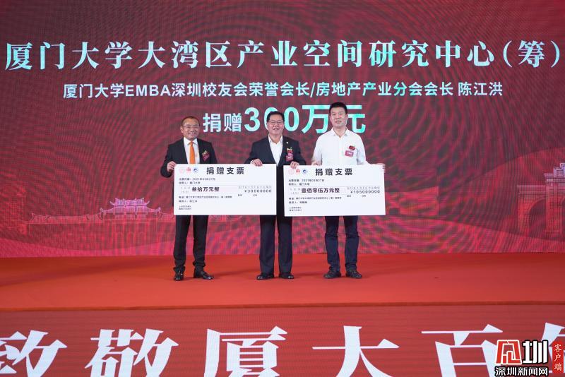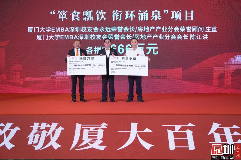 夜幕降临,致敬百年校庆——“戈16”出征仪式暨厦门大学 E MBA深圳校友会房地产产业分会晚宴正式拉开帷幕。为助力厦大百年,感恩回馈母校。晚宴中特设深圳校友会向学校捐赠仪式,其中:郑耀南会长、陈江洪会长共同牵头发起捐赠,成立厦门大学大湾区产业空间研究中心,郑耀南会长未来计划累计捐赠到1050万元,陈江洪会长未来计划累计捐赠到300万元;庄重永远荣誉会长及陈江洪荣誉会长各捐赠666万用于厦门大学“箪食瓢饮衔环涌泉”项目;陈江洪、程国红伉俪计划捐赠1000万元用于设立厦门大学化学化工学院“陈江洪程国红伉俪发展基金”,襄助厦门大学化学化工学院师资队伍建设、科教设施改造、实验安全管理等教育事业的发展;柳玉滨荣誉会长计划捐赠1000万元用于定向捐助学校贫困学生及取得科技成果奖的教师及学生。