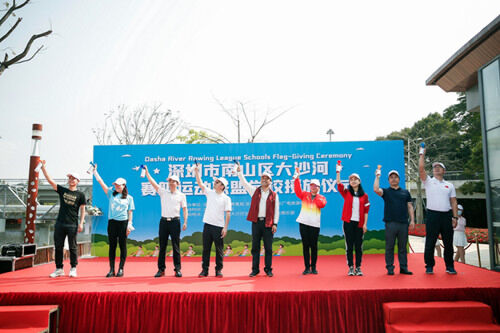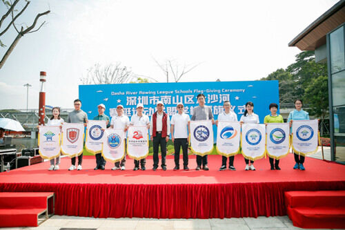 南山区委常委、宣传部部长廖子彬,南山区政协副主席、教育局局长刘根平,南山区文化旅游广电体育局副局长陈登福,南山区教育局副局长杨珺等出席活动。与会领导向10所赛艇联盟学校代表授旗。