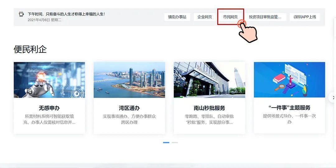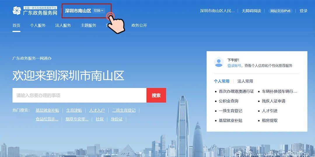 登录广东政务服务网,将行政部门切换至深圳市—南山区,点击“市民网页”,在“深圳市民个人网页”点击“证照中心”,即可查看个人电子证照信息。