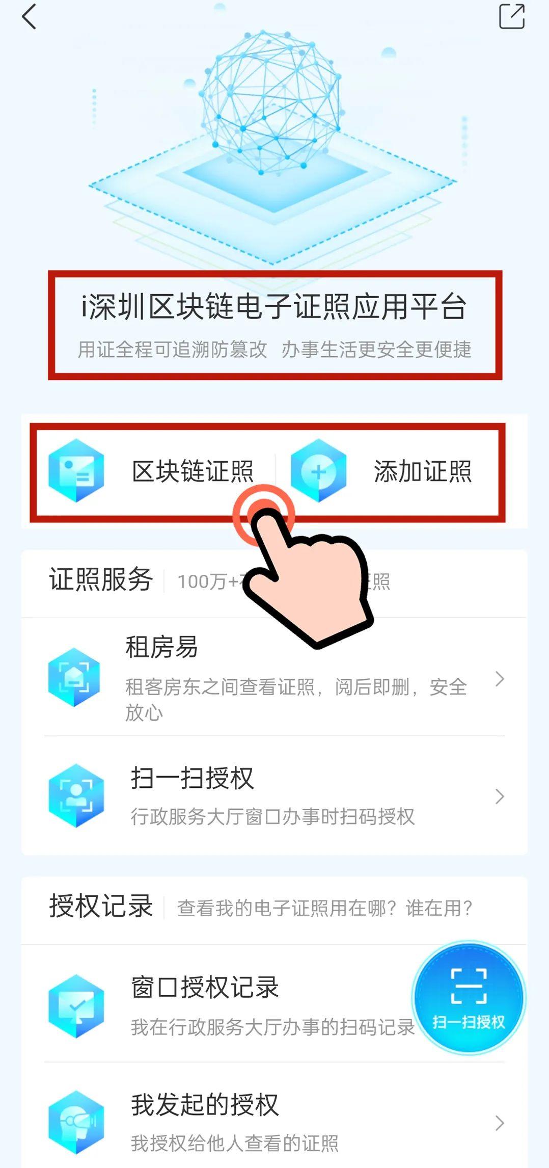 打开“i深圳”App,在首页“上新服务”栏目——更多服务中找到区块链电子应用,实名认证后即可添加和查看本人名下的电子证照。
